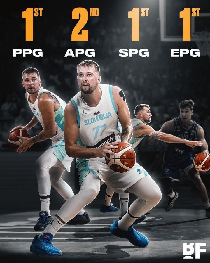 今年欧锦赛小组赛,东契奇出场5次,场均登场33.4分钟可以砍下32.4分8篮板8.4助攻3.2抢断,场均效率值是35.4,其中得分和抢断以及效率值均列赛会第一,助攻排名第二。